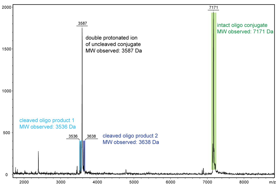 The decomposition products shown here were generated by a short laser pulse, the majority of the oligo remains uncleaved (green peak). The large left peak shows the double-protonated ion of the uncleaved conjugate (MW 3587 Da).