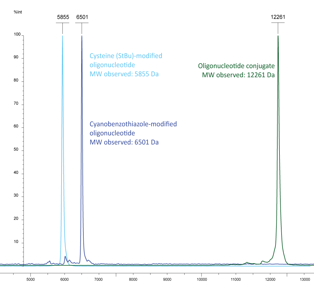Figure 3b): In light blue a cysteine labelled oligonucleotide (5´-cysteine-gctgcctcccgtaggagt, MW 5849) and in dark blue a 5´-cyanobenzothiazole-EUB 338-probe (5´-CBT-gctgcctcccgtaggagt-6-Fam, MW 6497) are shown, the conjugate is shown in green with the molecular weight of 12261, representing the sum of the two individual molecules.