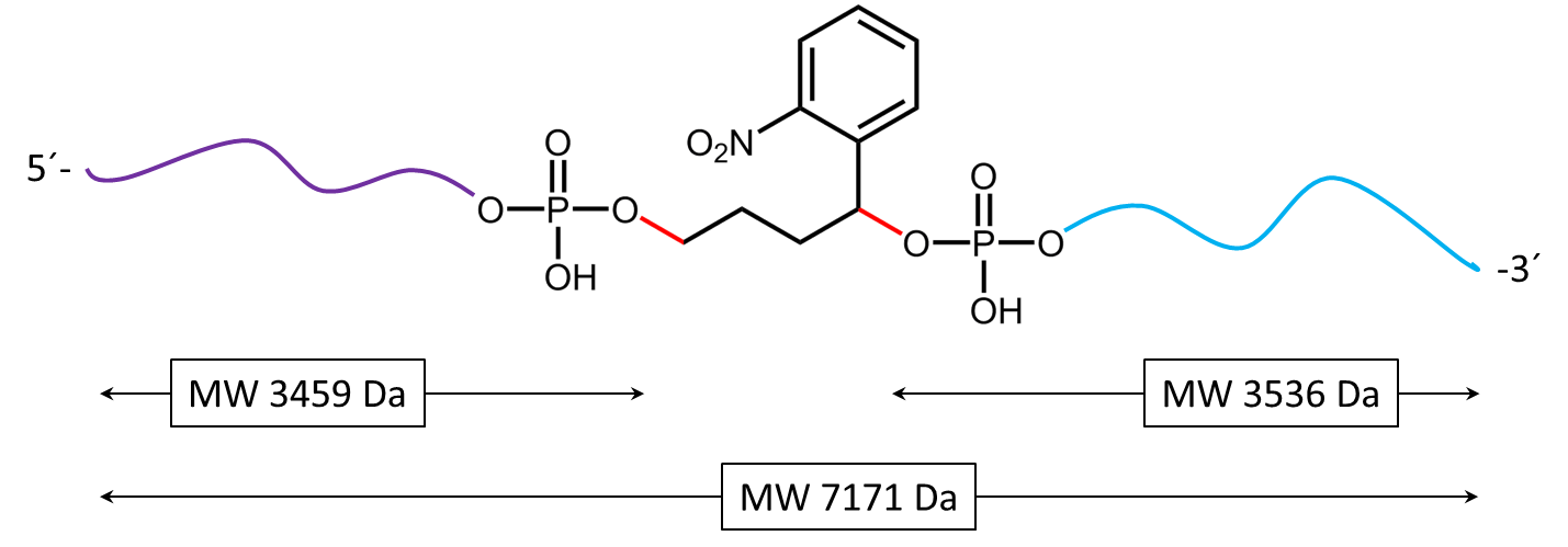 For a complete cleavage of the photolabile linker in the oligo, light exposure takes longer, usually a few minutes. If the exposure is sufficiently long, the linker itself also disintegrates. In the following Figure 4, another cleavage product is shown after 30 minutes of exposure. Here, the linker which has already been cleaved completely falls off the oligo.