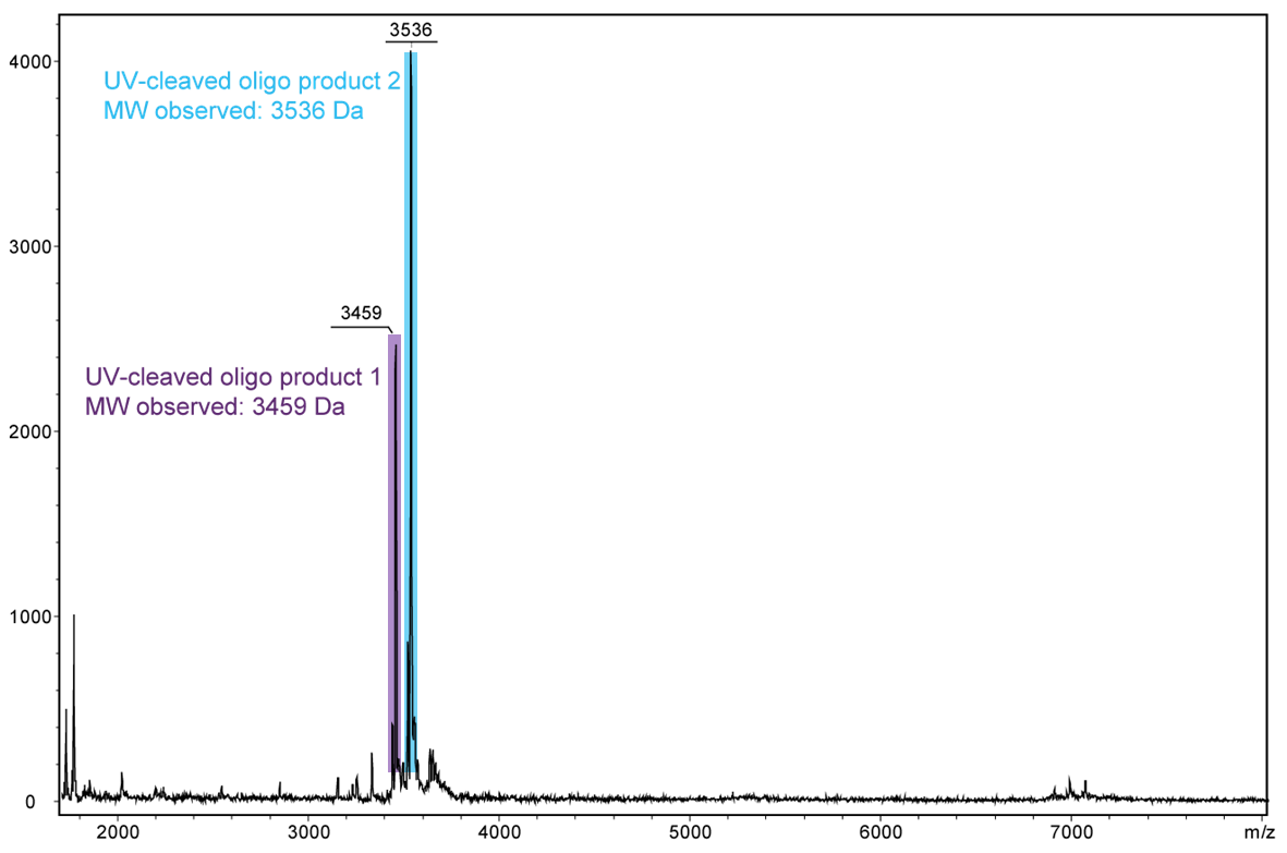 Figure 4) shows the result of the Maldi analysis of the oligo conjugate in aqueous solution after irradiation with UV light at 365 nm for 30 min. If the PC linker is irradiated with UV light, it disintegrates and completely falls off the oligo. The spectrum shows the two cleavage products of the conjugate: 5´-antraquinone-TTT TTT TTT T-Phos-3´ (highlighted in purple, 3459 Da) and 5´-Phos-TTT TTT TTT T-BMN Q535-3´ (highlighted in light blue, 3536 Da). The oligo conjugate is completely cleaved after UV exposure.