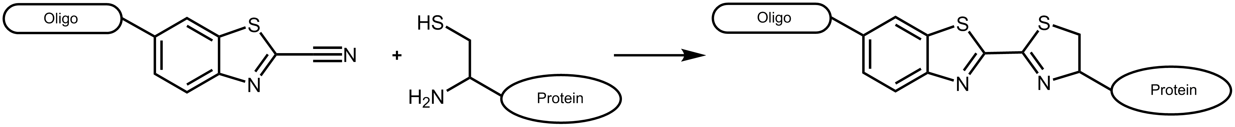 Figure 1: Reaction scheme of a cyanobenzothiazole-labelled oligonucleotide with a suitable protein carrying an N-terminal cysteine.